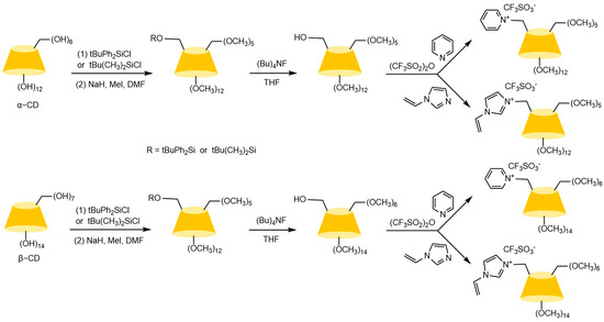 | mono-6-deoxy-6-pyridin-1-ium/ mono-6-deoxy-6-(1-vinyl-1H-imidazol-3-ium)-α/ β-cyclodextrin trifluoromethanesulfonate ionic liquids | α, β, γ-CD | one-pot reaction solvent-free procedure | lactone epoxides hydroxy esters heavy ester | [52] |
