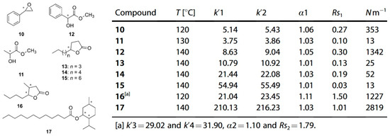 Chromatographic parameters of enantiomeric separation of eight compounds (10–17) in an ionic liquid cyclodextrin stationary phase column. Figures adapted and reprinted with permission from Ref. [52].