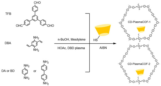 Synthesis of CD-PlasmaCOF-1 and CD-PlasmaCOF-2 using plasma-induced polymerization combined with a post-synthesis modification strategy [61].