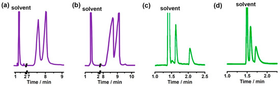(a,b) are enantiomeric separations on a CD-PlasmaCOF-1 coated GC column; (c,d) are enantiomeric separations on a CD-PlasmaCOF-2 coated GC column. (a) alanine: column temperature 100 °C under an N2 flow rate of 16.91 cm/s, and (b) valine: column temperature 120 °C under an N2 flow rate of 17.25 cm/s; (c) glutamine: column temperature 150 °C under an N2 flow rate of 16.7 cm/s, and (d) serine: column temperature 155 °C under an N2 flow rate of 15.9 cm/s on CD-PlasmaCOF-1 and CD-PlasmaCOF-2 coated GC columns. Figures adapted and reprinted with permission from ref. [61].
