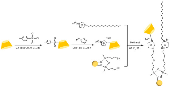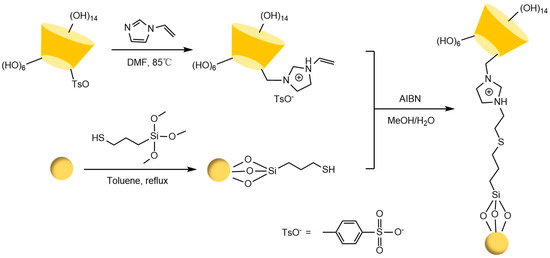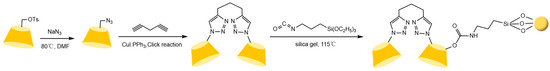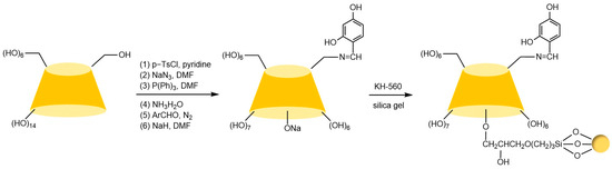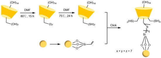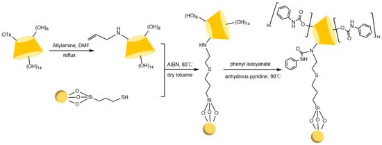 The physical coating method [65] involves adsorbing cyclodextrin derivatives directly onto silica gel surfaces. While straightforward (e.g., Wang et al. [66] successfully prepared a novel stationary phase by coating silica gel with cationic cyclodextrins, as show in Figure 10), this method suffers from limitations such as low mechanical strength and restricted applicability in normal-phase chromatography, resulting in limited research and application.