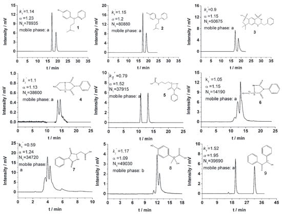 With the advancement of related disciplines, chiral compounds have found increasingly extensive applications in pharmaceuticals [1], fragrances [2], and pesticides [3]. Particularly, chiral drug research has emerged as the central focus in chiral science [4,5]. Currently, the majority of chiral drugs are still administered as racemic mixtures. However, in non-chiral environments, although enantiomers possess identical physicochemical properties, they ultimately exhibit distinctly different pharmacological activities, metabolic behaviors, or toxicological characteristics within biological systems due to selective differences in their interactions with chiral biomacromolecules. This characteristic not only highlights the crucial role of chiral substances in biological systems but also drives the demand for developing high-efficiency and low-toxicity pharmaceuticals. Chiral separation analysis constitutes not only a key technology but also an imperative requirement for ensuring drug safety and environmental security. Existing separation techniques include crystallization [6], chromatography [7], liquid membrane separation [8], and chiral extraction [9], among which chromatographic methods employing chiral stationary phases have been demonstrated as the most effective separation approach [10,11].