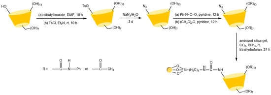 - Lin, C.; Liu, W.N.; Fan, J.; Wang, Y.K.; Zheng, S.R.; Lin, R.; Zhang, H.; Zhang, W.G. Synthesis of a novel cyclodextrin-derived chiral stationary phase with multiple urea linkages and enantioseparation toward chiral osmabenzene complex. J. Chromatogr. A 2013, 1283, 68–74. [Google Scholar] [CrossRef]