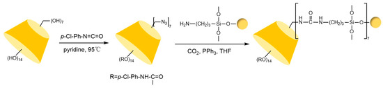 The key to preparing urea bond-linked stationary phases via the Staudinger reaction lies in the selective reaction between azido-functionalized β-cyclodextrin and aminated silica under CO2 conditions. Ng’s team [91] successfully constructed a cyclodextrin stationary phase connected by a single urea bond (see Figure 16) through precise control of reaction conditions under triphenylphosphine catalysis. This phase not only exhibited excellent chemical stability but also significantly enhanced chiral recognition capabilities due to its hydrogen bond donor properties. Notably, the hydroxyl-sensitive nature of this reaction system limits its application in the modification of certain derivatized cyclodextrins. Building on this, Lin et al. [71] innovatively immobilized hepta(6-azido-6-deoxy-2,3-di-O-(p-chlorobenzyl carbamate))-β-cyclodextrin onto silica via multiple urea bonds in Figure 17, achieving successful enantioseparation of metal-based chiral benzene complexes. However, residual amino groups on the silica surface from incomplete reactions may interfere with the separation process through hydrogen bonding interactions.