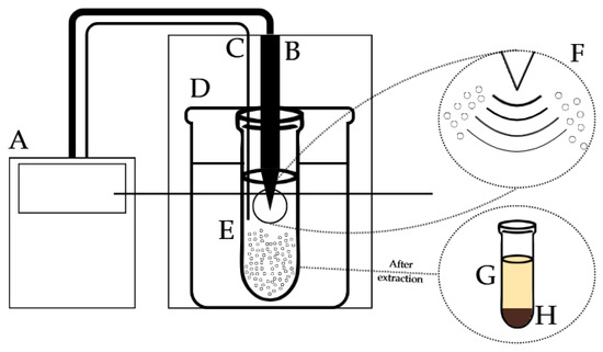 Scheme of ultrasound-assisted extraction of banana inflorescence. A—ultrasound generator, B—ultrasound cylinder probe, C—temperature sensor, D—water bath, E—extraction procedure, F—bubble cavitation phenomenon, G—banana inflorescence extract, H—banana inflorescence residue.