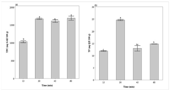 Regarding the effect of extraction time (Figure 2), under extraction conditions previously defined (1:30 g/mL, 55 °C, and 350 W), it was observed that the TFC reached its peak in 30 min, after which a decrease in its contents occurred. Maximum TPC extraction also occurred in 30 min, remaining constant after this time.