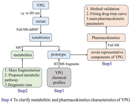 Herein, based on our previous global chemical profiling of YPG [14], a set of sensitive UHPLC-MS methods was established to qualitatively identify the prototype compounds from YPG and their metabolites in rat blood, and quantitively analyze the pharmacokinetic characteristics of YPG’s seven major components. Figure 1 illustrates the proposed schematic diagram. The present study might be conducive to the comprehensive understanding of the pharmacodynamic basis of YPG in further research. This study systematically investigated the in vivo metabolic profile of YPG through comprehensive qualitative analysis of its absorbed prototype components and metabolites in plasma using UHPLC-MS based techniques. However, there are still limitations in this investigation. For instance, most of the compounds were not quantitatively determined; only male rats were used in the experiment, despite sexual dimorphism. Further researches may include designs of more quantitative analysis using disease models, as well as more attention on samples other than serum, tissues, urine, and fecal samples.