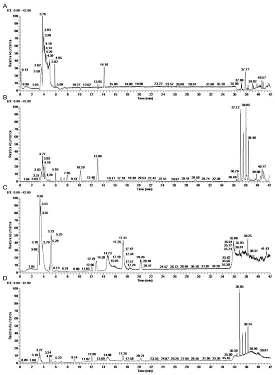 BPCs of in vivo components of YPG. (A) Drugged plasma in negative ion mode; (B) drugged plasma in positive ion mode; (C) blank plasma in negative ion; (D) blank plasma in positive ion mode.