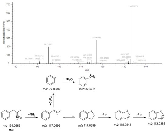 P2 belongs to the alkaloid group of compounds, and the predominant alkaloids in YPG are ephedra alkaloids and isomers [37]. M38 (RT = 11.08 min) exhibited the [M + H]+ ion at m/z 134.0965, which was ascertained to be C9H11N with a molecular weight 18.0105 Da (H2O) less than that of P2. The fragment ions of M38 have been identified as m/z 117.0699, 115.0543, 113.0386, 95.0492. The MS2 spectrum and possible fragmentation pathway of M38 is shown in Figure 3.