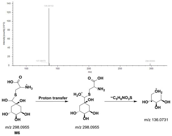 M6 was screened out as a xenobiotic associated with N4. M6 was generated from N4 after a series of metabolic reactions, including dehydration, reduction, and cysteine conjugation. M6 (RT = 10.92 min) showed the [M + H]+ ion at m/z 298.0955, which was determined to be C10H19NO7S, 105.0248 Da (C3H7NOS) greater than that of N4. Since the characteristic fragments after sequentially losing 162.0224 Da (C5H8NO3S) at m/z 136.0731 was observed. The MS2 spectrum and possible fragmentation pathways of M6 are shown in Figure 4.