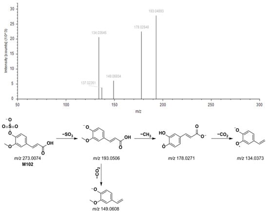 M102 was discovered after N45 underwent phase I metabolic sulfation. M102 (RT = 20.10 min, m/z 274.0147) has a molecular formula of C10H19NO7S, with a weight of 79.9568 Da (SO3), greater than that of N45. The fragment ions of M102 are m/z 193.0506, 149.0608, 178.0271, and 134.0373. The MS2 spectrum and possible cleavage pathways of M102 are shown in Figure 5.