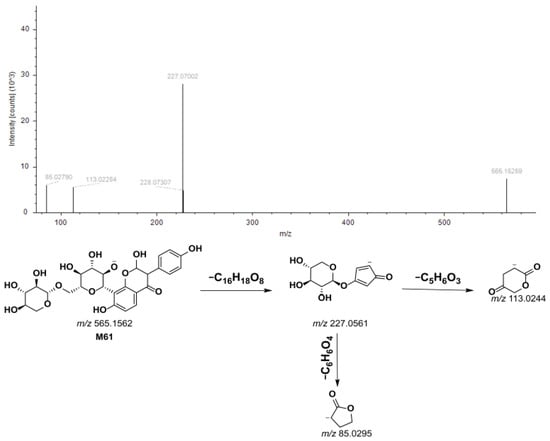 M61 (RT = 17.99 min) was identified as the metabolite of P15 underwent hydration. M61 exhibited the [M − H]− ion at m/z 565.1562, which was quantified as C26H30O14, 18.0105 Da (H2O) greater than that of P15. The characteristic fragments after sequentially losing 338.1001Da (C16H18O8), 114.0317 Da (C5H6O3), and 142.0266 Da (C6H6O4) at m/z 227.0561, 113.0244, and 85.0295 were observed. The MS2 spectrum and possible fragmentation pathway of M61 are shown in Figure 6.