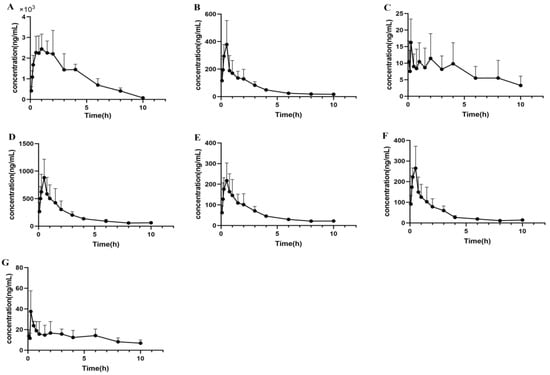 The blood concentration was performed in accordance with the standard curve equation. The concentration–time curves were subsequently generated using GraphPad Prism 9 software, as shown in Figure 7. The data were then analyzed using DAS 3.2.6 software, and seven main parameters were obtained: time to peak concentration (Tmax), peak plasma concentration (Cmax), area under the drug–time curve (AUC0–∞), terminal elimination half-life (t1/2), mean residence time (MRT0–∞), clearance (CLz/F), apparent volume of distribution (Vz/F). The detailed results are presented in Table 2.