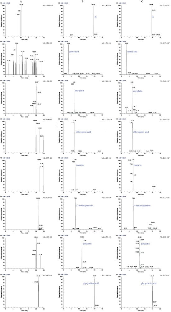 To prepare the stock solutions, seven reference substances were dissolved in methanol at the following final concentrations: quinic acid, 2.0 mg/mL; chlorogenic acid, 2.0 mg/mL; puerarin, 2.0 mg/mL; 3′-methoxypuerarin, 1.0 mg/mL; polydatin, 1.0 mg/mL; glycyrrhizic acid, 0.5 mg/mL; amygdalin, 0.5 mg/mL. Icariin (IS, 250 ng/mL) was meticulously prepared in methanol. A working solution of 10 μL was added to the blank plasma to prepare a working solution of 100 μL. The following calibrators were prepared by serial dilution method: quinic acid at 50, 100, 200, 500, 2500, 6000, and 7000 ng/mL; chlorogenic acid at 1, 5, 10, 50, 100, 500, and 1500 ng/mL; puerarin at 10, 25, 50, 100, 500, 1500, and 3000 ng/mL; 3′-methoxypuerarin at 5, 10, 5, 50, 100, 250, and 1000 ng/mL; polydatin at 1, 5, 10, 25, 50, 250, and 1000 ng/mL; glycyrrhizic acid at 0.1, 0.25, 0.5, 1, 5, 25, and 150 ng/mL; and amygdalin at 0.25, 0.5, 1, 5, 10, 25, and 100 ng/mL. The preparation of low-, medium-, and high-concentration QC samples is as follows: quinic acid at 300, 3000, 6000 ng/mL; chlorogenic acid at 50, 600, 1200 ng/mL; puerarin at 150, 1400, 2800 ng/mL; 3′-methoxypuerarin at 50, 450, 900 ng/mL; polydatin at 50, 450, 900 ng/mL; glycyrrhizic acid at 5, 70, 140 ng/mL; and amygdalin at 5, 45, 90 ng/mL.