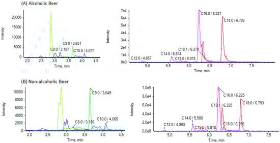 Although methods for the determination of FFAs in beers exist [5,6,28] and data on the contents of FFAs in alcoholic beers can be found in the literature, detailed data for FFAs in non-alcoholic beers are missing. In the case of non-alcoholic beers, their different production methods may result in variations in FFA content. Thus, the aim of the present work was the development and validation of an analytical method for the detection and quantification of a large set of FFAs in beers, applying a simple and mild protocol for sample preparation and avoiding a derivatization step. Herein, we present a liquid chromatography–high-resolution mass spectrometry (LC-HRMS) method, allowing the determination of a variety of medium- and long-chain FFAs in beer samples. This method was applied for the determination of FFAs in non-alcoholic and alcoholic beer samples from the local market, allowing the comparison of the FFA profiling of alcoholic and non-alcoholic beers. Furthermore, principal component analysis (PCA) was applied to explore the correlation of FFA profiling with the type of beer (alcoholic or non-alcoholic).
