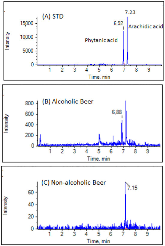EICs of phytanic and arachidic acid in standard solutions (1000 ng/mL) (A) in a representative alcoholic beer sample (B) and in a representative non-alcoholic beer sample (C).