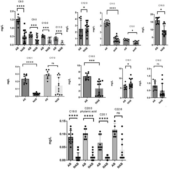 Comparison of beer concentrations (mg/L) of C8:0, C9:0, C10:0, C11:0, C12:0, C14:0, C15:0, C16:0, C16:1, C17:0, C18:0, C18:1 (oleic acid), C18:2, C19:0, C20:0 phytanic acid, C20:1 and C22:6 between alcoholic and non-alcoholic beer samples. AB: alcoholic beers; NAB: non-alcoholic beers. One-way ANOVA statistical analysis was performed for each separate set comparing to control. ns (not significant): p > 0.05. * p < 0.05, *** p < 0.001, **** p < 0.0001.