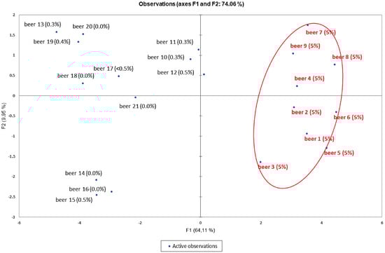Principal component analysis (PCA) plot of FFAs from alcoholic and non-alcoholic beer samples using 17 variables. Red circle indicates the cluster of alcoholic beers.
