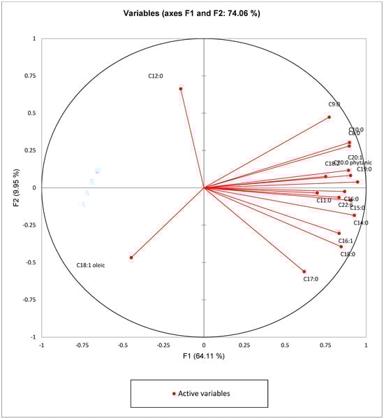 Multivariate statistical analysis was employed in order to explore the correlation of FFA contents with the presence or absence of alcohol in beers. In this context, we attempted to map the distribution of the beer samples and identify the alcoholic and non-alcoholic beer samples. The FFA data were analyzed via PCA to establish any “clustering” with respect to the two groups (alcoholic and non-alcoholic beer samples). A PCA model was constructed using 17 variables (C8:0, C9:0, C10:0, C11:0, C12:0, C14:0, C15:0, C16:0, C16:1, C17:0, C18:0, C18:1 oleic acid, C18:2, C19:0, C20:0 phytanic acid, C20:1 and 22:6), corresponding to the FFAs examined. The scree plot is presented in Figure S1 (Supplemental Material), showing Eigen values of 10.90 and 1.69 for PC1 and PC2, respectively. As depicted in Figure 4, the first two components of the model (PC1 and PC2) explain 74.06% of the variance, and the score plot of PC1 (64.11%) versus PC2 (9.95%) indicates a good discrimination of the two groups of beer samples. The alcoholic beer samples are located at the right part, while the non-alcoholic beer samples are located at the left part of the plot. Figure 5 shows the contribution of the variables to the first two components. C8:0, C9:0, C10:0, C11:0, C14:0, C15:0, C16:0, C16:1, C17:0, C18:0, C18:2, C19:0, C20:0 phytanic acid, C20:1 and 22:6 considerably contribute to PC1, while C12:0 to PC2 (see Tables S2 and S3, Supplemental Materials). Lauric acid as well as C18:1 oleic acid, located at the left part of the plot, are correlated with the non-alcoholic beer samples, while C8:0, C9:0, C10:0, C11:0, C14:0, C15:0, C16:0, C16:1, C17:0, C18:0, C18:2, C19:0, C20:0 phytanic acid, C20:1 and 22:6, located at the right part, are correlated with the alcoholic beer samples.