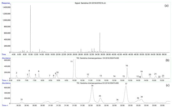 GC–MS chromatogram of Santolina chamaecyparissus flower essential oil: (a) full chromatogram; (b) enlarged view of the 6–16 min zone; (c) enlarged view of the 30–34 min zone.