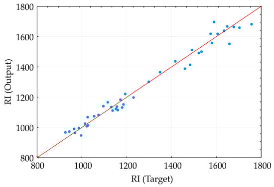 The calibration and predictive performance of the QSRR model were evaluated through validation, with the squared correlation coefficient (R2) used as an indicator of model fitness. To capture the nonlinear relationship between retention indices (RIs) and selected molecular descriptors, an artificial neural network (ANN) model was developed. The statistical results of the MLP 12-4-1 network are presented in Table 3, while Figure 3 presents the predicted RIs, demonstrating the ANN model’s predictive accuracy by illustrating the correlation between predicted and experimental retention values.