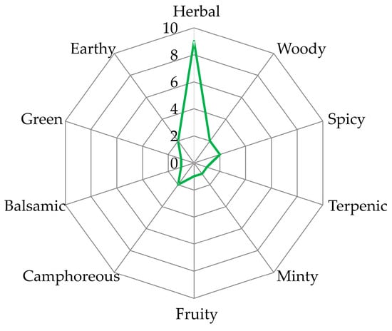 The sensory evaluation aimed to assess the odor of S. chamaecyparissus essential oil, following the methodology described by Tsitlakidou et al. [62]. A panel of fifteen experts conducted the evaluation in a specialized laboratory. The descriptive analysis covered fifteen aroma attributes, including herbal, woody, spicy, terpenic, minty, fruity, camphoraceous, balsamic, green, and earthy. Each essential oil sample was evaluated in triplicate using a 10-point interval scale (0 = none, 9 = extra strong). For odor detection, one centimeter of a smelling strip was dipped into each sample, and panelists took three quick, deep sniffs before removing the strip. Evaluations were performed with 20 s intervals between samples, ensuring clean air breaks between assessments.