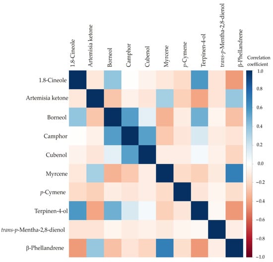The correlation analysis among the major compounds in the dataset reveals several statistically significant relationships (p < 0.05), highlighting potential biosynthetic or functional linkages between specific constituents. Notably, terpinen-4-ol shows a strong positive correlation with 1,8-cineole (r = 0.5699, p = 0.001) and borneol (r = 0.4831, p = 0.004), suggesting these compounds may share similar metabolic pathways. Myrcene is significantly correlated with β-phellandrene (r = 0.6822, p < 0.001), while camphor exhibits a strong positive correlation with borneol (r = 0.5511, p = 0.001) and cubenol (r = 0.5478, p = 0.001), indicating possible co-accumulation. The sum of marker compounds correlates significantly with artemisia ketone (r = 0.5704, p = 0.001) and camphor (r = 0.4710, p = 0.006), reflecting their substantial contribution to the overall profile. In contrast, trans-p-mentha-2,8-dienol and p-cymene show minimal and non-significant correlations with most other compounds, implying more independent variation. These patterns suggest specific clusters of compounds may be co-regulated or share biosynthetic origins in Artemisia spp. under the studied conditions.