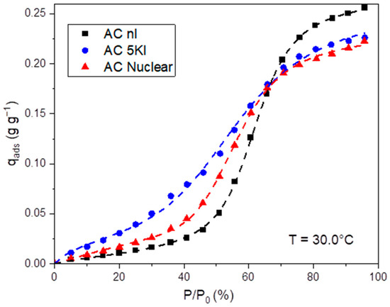 - An initial increase in adsorption kinetics occurs as a function of the water vapor concentration. The RH threshold for this augmentation is about 24% for AC NI and AC Nuclear. This value is shifted to a lower RH of about 18% for AC 5KI in agreement with its more pronounced hydrophilicity, as commented before.