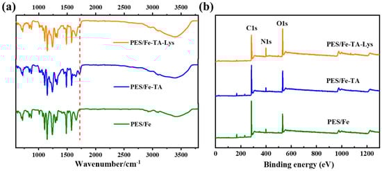 (a) FTIR spectra and (b) XPS spectra of the PES/Fe, PES/Fe-TA, and PES/Fe-TA-Lys membranes.