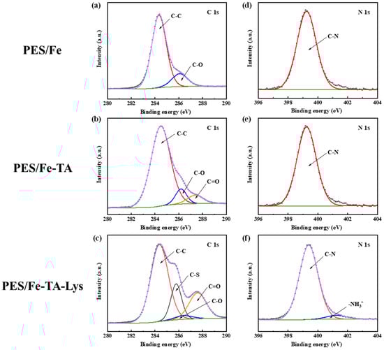 To further prove the introduction of TA and Lys on membrane surfaces, high-resolution XPS analysis was conducted on C 1s and N 1s core-level spectra across three membrane variants (Figure 3). The PES/Fe membrane has two main peaks at 284.6 eV and 286.3 eV, corresponding to C-C and C-O groups, respectively (Figure 3a). A new peak appeared in the PES/Fe-TA membrane at 287.5 eV (Figure 3b), which is the peak corresponding to the ester group C=O in TA, indicating that TA has been successfully introduced onto the surface of the film [19]. In contrast, the PES/Fe-TA-Lys membrane has a new peak at 285.6 eV (Figure 3c), which is contributed by the C-S in the Lys structure [31]. To further prove the introduction of Lys, the N 1s peaks of the three membranes were analyzed in detail. As shown in Figure 3d–f, compared with the PES/Fe membrane and PES/Fe-TA membrane, the PES/Fe-TA-Lys membrane has a new peak at 401.7 eV, which corresponds to the -NH3+ functional group. -NH3+ is provided by arginine and lysine residues in lysozyme [32]. This further shows that the surface of the PES/Fe-TA-Lys membrane is covered by lysozyme.