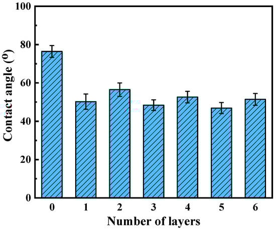 The evolution of surface wettability during the layer-by-layer assembly process was quantitatively monitored through static water contact angle (WCA) measurements, as systematically depicted in Figure 4. Initial PES/Fe substrates exhibited regular hydrophilicity (WCA = 76.4° ± 1.3°), characteristic of sulfone-containing polymer matrices [33]. The subsequent in situ deposition of a TA monolayer via FeIII-phenolic coordination dramatically enhanced surface hydrophilicity (ΔWCA = −26.2°), achieving a WCA of 50.2° ± 0.8°. This is due to the large number of hydrophilic phenolic hydroxyl groups in the TA molecule, which establish extensive hydrogen-bonding networks with water molecules through their ortho-dihydroxyphenyl moieties. Intriguingly, the covalent immobilization of Lys through Schiff base/Michael addition reactions induced a controlled hydrophobic shift (WCA = 55.8° ± 1.1°), representing a 11.2% reduction in WCA compared to TA-modified surfaces. However, after assembling a layer of Lys, the contact angle of the membrane increased slightly, which may be due to the covalent reaction between TA and Lys. In addition, lysozyme itself is hydrophobic, which changes the hydrophilicity of the hybrid membrane. Notably, the hierarchical assembly process maintains overall hydrophilicity (WCA < 60°), with cumulative WCA changes limited to 10.6° across three modification stages. This controlled wettability modulation demonstrates the precision of bio-inspired surface engineering in balancing hydration capacity and biofouling resistance, crucial for nanofiltration applications requiring both high flux and selective separation.
