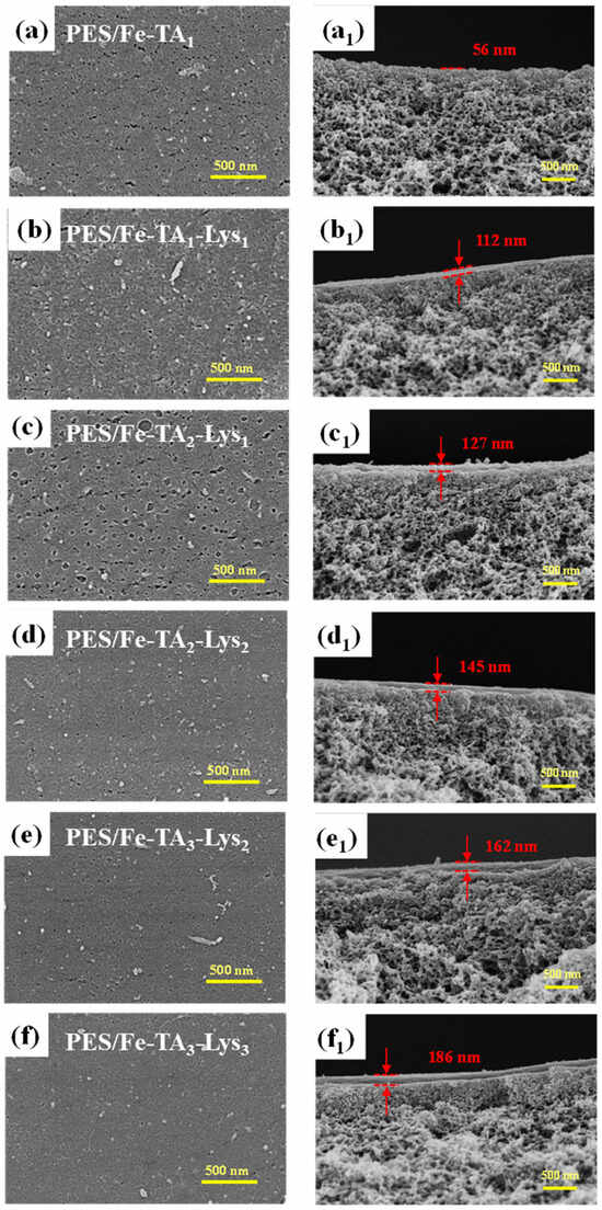 SEM analysis of the top surface (a–f) and cross-section (a1–f1) morphologies of PES/Fe-TA and PES/Fe-TA-Lys membranes.