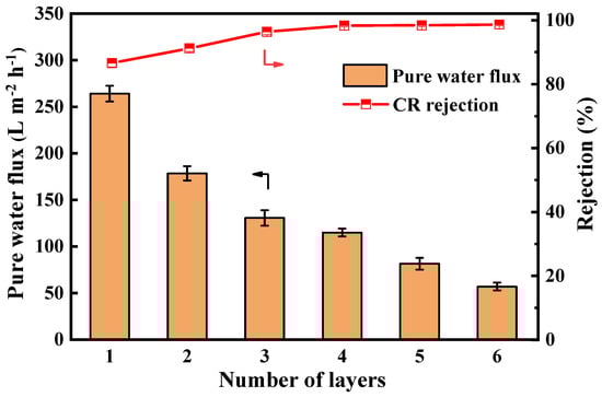 The filtration performance results of membranes with different numbers of assembled layers are shown in Figure 7. Pure water flux decreased exponentially from 264 L·m−2·h−1 (1 layer) to 57 L·m−2·h−1 (6 layers), reflecting progressive active layer densification. The rejection rate of CR by the LNF membrane increased from 86.6% to 98.7%. This improvement is attributed to the assembly of TA and Lys, which forms a thicker and denser active layer on the membrane surface and enhances its negative surface charge. The combined effects of electrostatic repulsion and size exclusion contribute to the enhanced retention of the anionic dye CR. Comprehensively considering the water flux and dye rejection, the assembly layer was four layers in the following experiments. The pure water permeability of the nanofiltration membrane prepared under this condition was 115 L∙m−2∙h−1, and the rejection rate of CR was 98.3%.