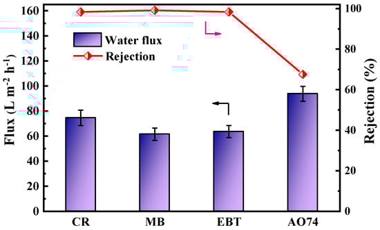 To further explore the NF separation performance, CR, MB, EBT, and AO 74 were selected as representative dyes for the separation performance test of a single component, and the results are shown in Figure 8. The permeation fluxes of the PES/Fe-TA-Lys loose nanofiltration membrane to the CR, MB, EBT, and AO 74 were 74.6 L∙m−2∙h−1, 61.5 L∙m−2∙h−1, 63.6 L∙m−2∙h−1, and 93.8 L∙m−2∙h−1; the corresponding rejection rates were 98.3%, 99.2%, 98.4%, and 67.6%, respectively. The difference in the retention performance of dyes with different molecular weights can be explained by the pore size screening effect. Compared with the AO 74 with smaller relative molecular weights, CR, MB, and EBT have larger relative molecular weights (696.66, 799.80, and 461.38, respectively). The space resistance will be greater when passing through the membrane, which makes it easier to be intercepted by the dense membrane pores [11]. At the same time, the charge repulsion effect will also affect the dye retention effect. For example, although the molecular weight of CR is smaller than that of MB, the prepared loose nanofiltration membrane has a higher rejection rate of CR than that of MB, which is mainly due to the high negative charge of CR and the agglomeration effect [36].