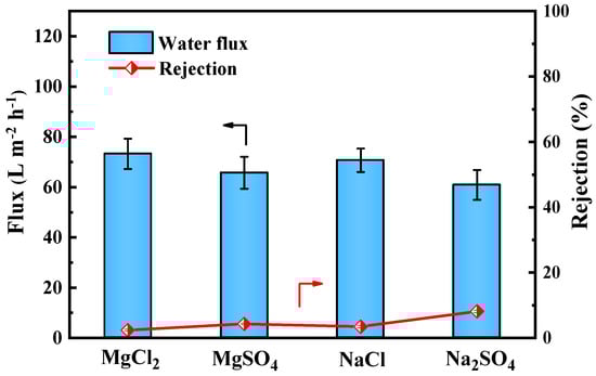 As shown in Figure 9, the PES/Fe-TA-Lys LNF membrane has a relatively low rejection rate of the four inorganic salts (R < 10%), and the retention performance order is Na2SO4 (8.2%) > MgSO4 (4.3%) > NaCl (3.5%) > MgCl2 (2.4%), consistent with its design as an LNF membrane. This behavior primarily resulted from Donnan exclusion. The negatively charged membrane surface (confirmed by zeta potential measurements) effectively repelled sulfate anions (SO42−), leading to higher Na2SO4 rejection compared to chloride salts. The divalent SO42− experienced stronger electrostatic repulsion than monovalent Cl−, explaining the observed retention order between sulfate and chloride salts [37]. On the contrary, Mg2+ more easily penetrates the membrane pores than Na+ [38]. Therefore, among the four inorganic salts, the rejection rate of MgCl2 is the lowest, while the rejection rate of Na2SO4 is the highest. Considering this comprehensively, the PES/Fe-TA2-Lys2 LNF membrane has a high rejection rate of CR (98.3%), a low rejection rate of NaCl (3.5%), a high dye rejection rate, and a low salt rejection rate. It shows the separation performance of a typical loose nanofiltration membrane, and has potential application prospects in dye desalination.