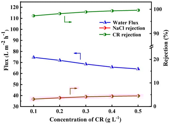 The dye/salt fractionation capability of the PES/Fe-TA-Lys LNF membrane was systematically evaluated under varying Congo Red (CR) concentrations (0.1–0.5 g/L) in mixed NaCl solutions (1 g/L), as demonstrated in Figure 10. The CR rejection efficiency exhibited a logarithmic increase from 97.3% to 99.6%, while NaCl rejection rose linearly from 3.1% to 4.47%. This was primarily ascribed to the fact that the CR dye molecules with a higher concentration tend to form a denser fouling layer as additional resistance on the membrane surface. In addition, the negatively charged CR dye is adsorbed on the surface of the membrane, which enhances the negative charge of the membrane surface, thereby promoting the retention of CR and NaCl [39,40,41]. Furthermore, the flux declined from 74.6 L∙m−2∙h−1 to 64.1 L∙m−2∙h−1, which was due to the reverse osmosis pressure generated by the dye concentration difference across the membrane and dye adsorption into the membrane pore. In summary, the higher rejection rate of dye and the lower rejection rate of inorganic salt indicate that the prepared PES/Fe-TA-Lys LNF membrane can be applied to dye desalination.