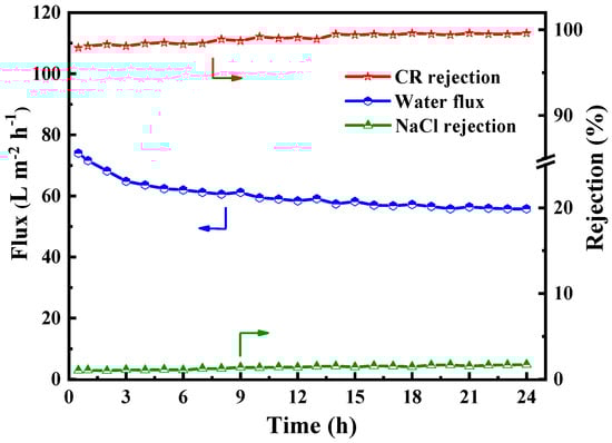 In order to determine the practical applicability of the PES/Fe-TA-Lys LNF membrane in dye/salt separation, we used a mixed solution of 0.1 g/L CR and 1 g/L NaCl to investigate the long-term operational stability of the membrane. As shown in Figure 11, the permeation flux dropped from 74 L∙m−2∙h−1 to 62 L∙m−2∙h−1 in the first 6 h, which may be due to the adsorption behavior of the dye on the membrane surface [45]. However, because the prepared PES/Fe-TA-Lys loose nanofiltration membrane has excellent antifouling performance, after about 9 h, the adsorption establishes a dynamic equilibrium, and the permeation flux only slightly changes (about 57.2 L∙m−2∙h−1). In addition, during the 24h filtration process, the rejection rate of CR can be maintained above 97.9%, the rejection rate of NaCl is below 4.8%, and the separation efficiency of dye/salt is maintained at a high level. The results show that the optimized PES/Fe-TA-Lys loose nanofiltration membrane has good long-term stability, which promotes its further practical application in dye wastewater treatment.