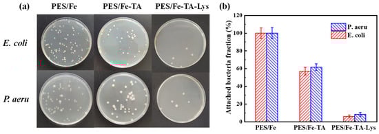 (a) The photographs of growing viable colonies of E. coli and P. aeru and (b) the fraction of bacteria attached to the membrane surface.