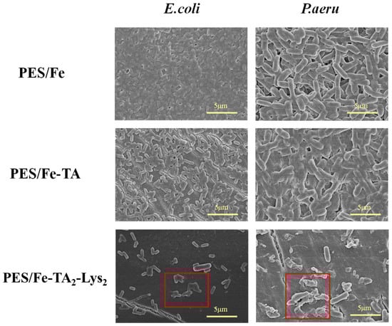 SEM images of bacterial morphologies (E. coli and P. aeru) on the membranes.