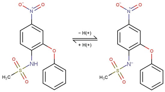 Chemical formulas of acid–base forms of nimesulide (pKa = 6.5).