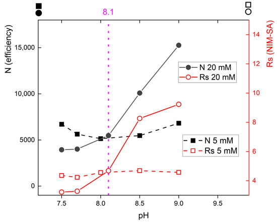 The dashed line with full squares in Figure 2 shows that at 5 mM borate buffer, both the parameters remained practically constant across the pH range; resolution NIM–SA was around 4 (right y-axis); and efficiency was around 6000 (the right y-axis). Such low efficiency suggests that the conditions across all tested pH levels does not provide an optimum for separation. The solid line with open circles in Figure 2 evaluates the relationship in a 20 mM borate buffer (with 10% methanol) between NIM efficiency and resolution NIM-SA across pH levels of 7.5, 8.0, 8.5, and 9.0. The efficiency trace N (full circles, left y-axis) exhibits a sharp increase at higher pH 8.5 and 9.0, with the number of theoretical plates increasing significantly from 5000 to 16,000. The highest resolution is achieved at pH 9.0 (up to 14), whereas the resolution across all measured pH levels 7.5–9.0 with the 5 mM buffer remains consistently between 4–5.