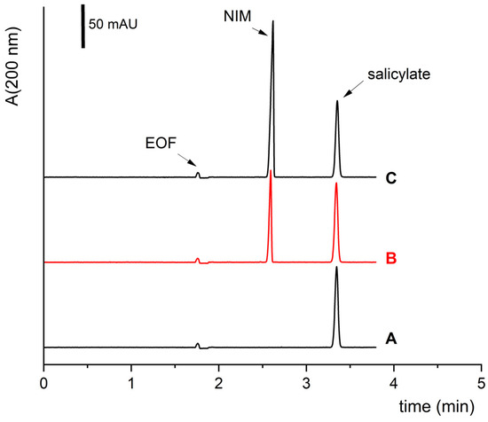 The selectivity of the method under optimized experimental conditions (Table 2). The run time is less than 4 min. Electropherogram (A) shows a blank (a sample with internal standard of NaSA); electropherogram (B) is a typical electropherogram of a sample containing NIM; and electropherogram (C) shows the sample (B) spiked with a standard of NIM. The concentration of sodium salicylate was always 0.1 mg/mL, and the concentration of NIM was 0 (A), 0.1 (B), and 0.4 (C) mg/mL, resp.