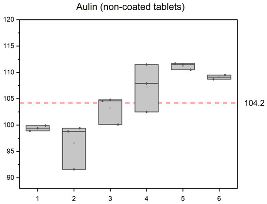 First, six Aulin non-coated tablets were analyzed in triplicate. The results are graphically presented in Figure 5. In the non-coated tablets, the average value determined was 104.2 mg of NIM per a tablet. The calculated average RSD of the determined mass was 2.6%, which reflects not only the method precision but also content variability of the active compound in the tablets. Nevertheless, all the values fit 85–115% of the average content.