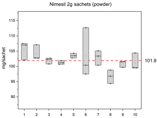Finally, the content uniformity test was carried out. Figure 6 illustrates the measured nimesulide (NIM) content in 10 sachets randomly selected from a batch of 30 Nimesil oral suspension sachets (according to the content uniformity test, Test A [27]).