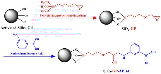 The synthetic route of SiO2-GP-APBA is shown in Figure 1. It consisted of two steps. The detailed procedures were as follows: