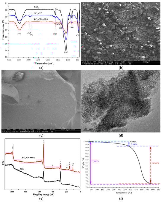 The FT-IR spectra of SiO2-GP-APBA and its intermediates (a); the SEM images of SiO2-GP-APBA (b,c); the TEM image of SiO2-GP-APBA (d); XPS spectra of SiO2-GP-APBA and SiO2 (e); and TGA curve of SiO2-GP-APBA (f).