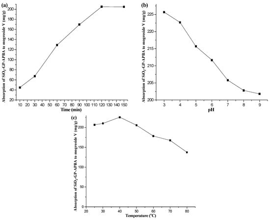 Temperature can greatly affect the analyte and the functional groups on an absorbent. Thus, the effect of temperature on the adsorption of mogroside V to SiO2-GP-APBA was investigated. Twenty mg of SiO2-GP-APBA was added to 4 mg/mL of the mogroside V solution with temperature settings at 25, 30, 40, 50, 60, 70, and 80 °C. After shaking for 150 min, the mixture was centrifuged at 4000 rpm and the supernatant was measured. The results are shown in Figure 3c. At a low temperature (25–40 °C), the absorption to mogroside V slightly increased. The adsorption performance decreased with the increase in temperature above 40 °C due to the decreased activity of boronic acid with the increasing temperature. On the one hand, the concentration of mogroside V decomposed easily under high temperature. In addition, because of the cost, the adsorption process was performed at room temperature.
