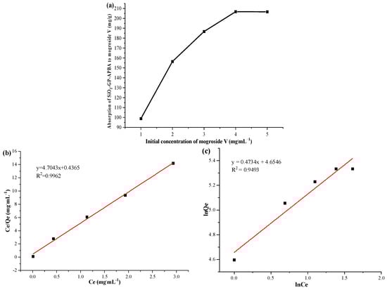 Effect of initial concentration (a) on the absorption of SiO2-GP-APBA to mogroside V, Langmuir isotherm (b), and Freundlich isotherm (c).