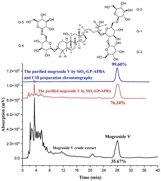 After the initial purification of the mogroside V crude extract by SiO2-GP-APBA, it was further prepared and purified by LC-6AD semi-preparative liquid chromatography (China Shimadzu Enterprise Management Co., Ltd.) to obtain the highly purified mogroside V. Chromatographic separation was carried out on a C18 column (30 mm × 250 mm, 5 μm). The mobile phase was the mixture of acetonitrile and H2O (22:78, v/v). The flow rate was 15 mL/min. The detection wavelength was at 203 nm. The purified mogroside V was checked by HPLC and NMR.