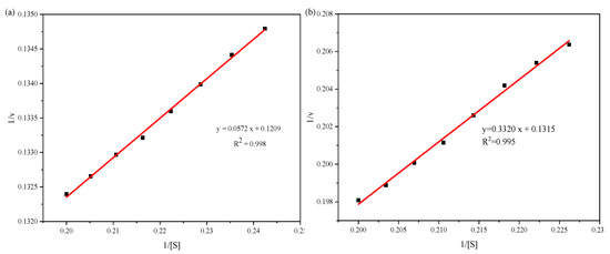 The regression line using double reciprocal method to determine the α-glucosidase kinetic constant (a) and inhibitory constant of mogroside V (b).